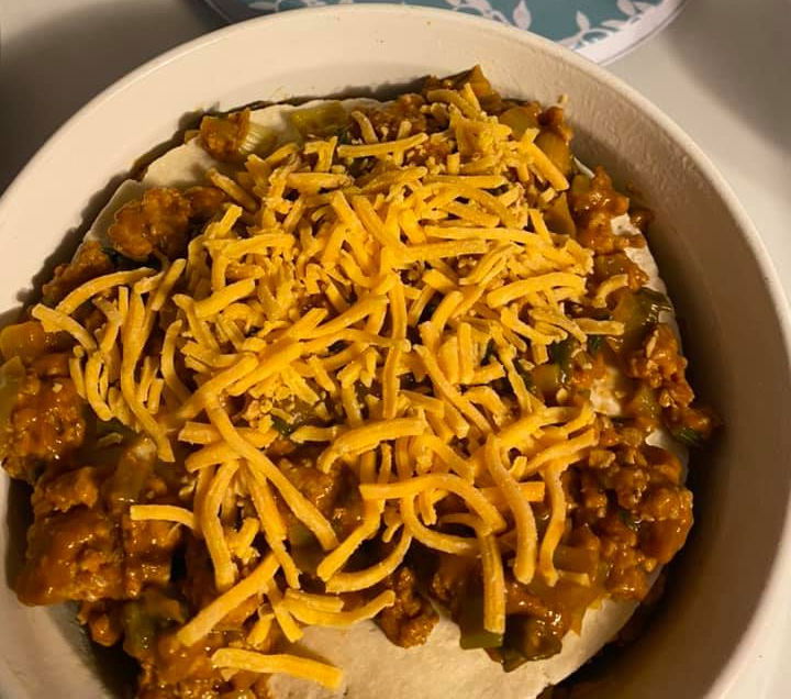 7. Repeat this layering with remaining tortillas, meat & cheese.